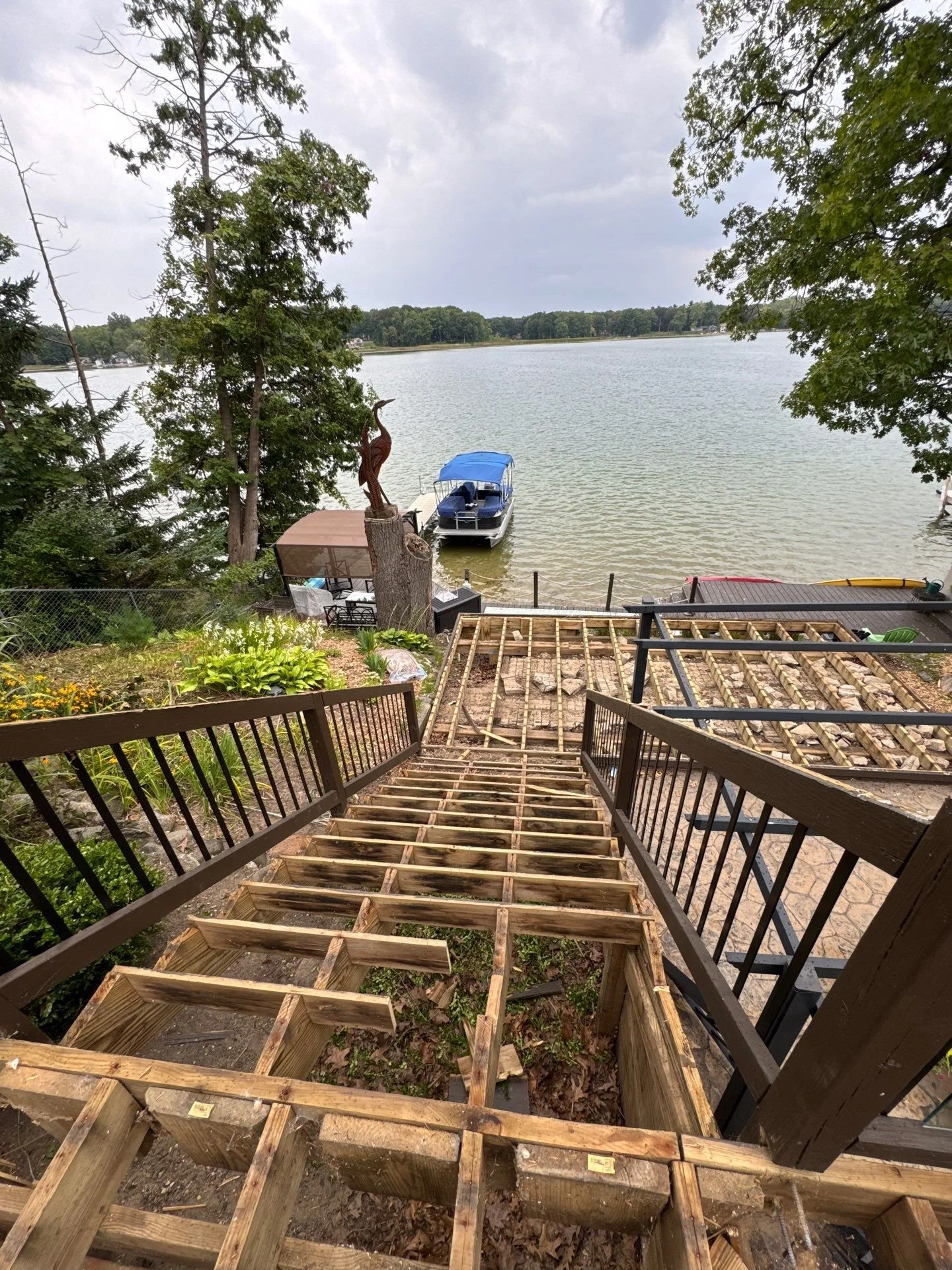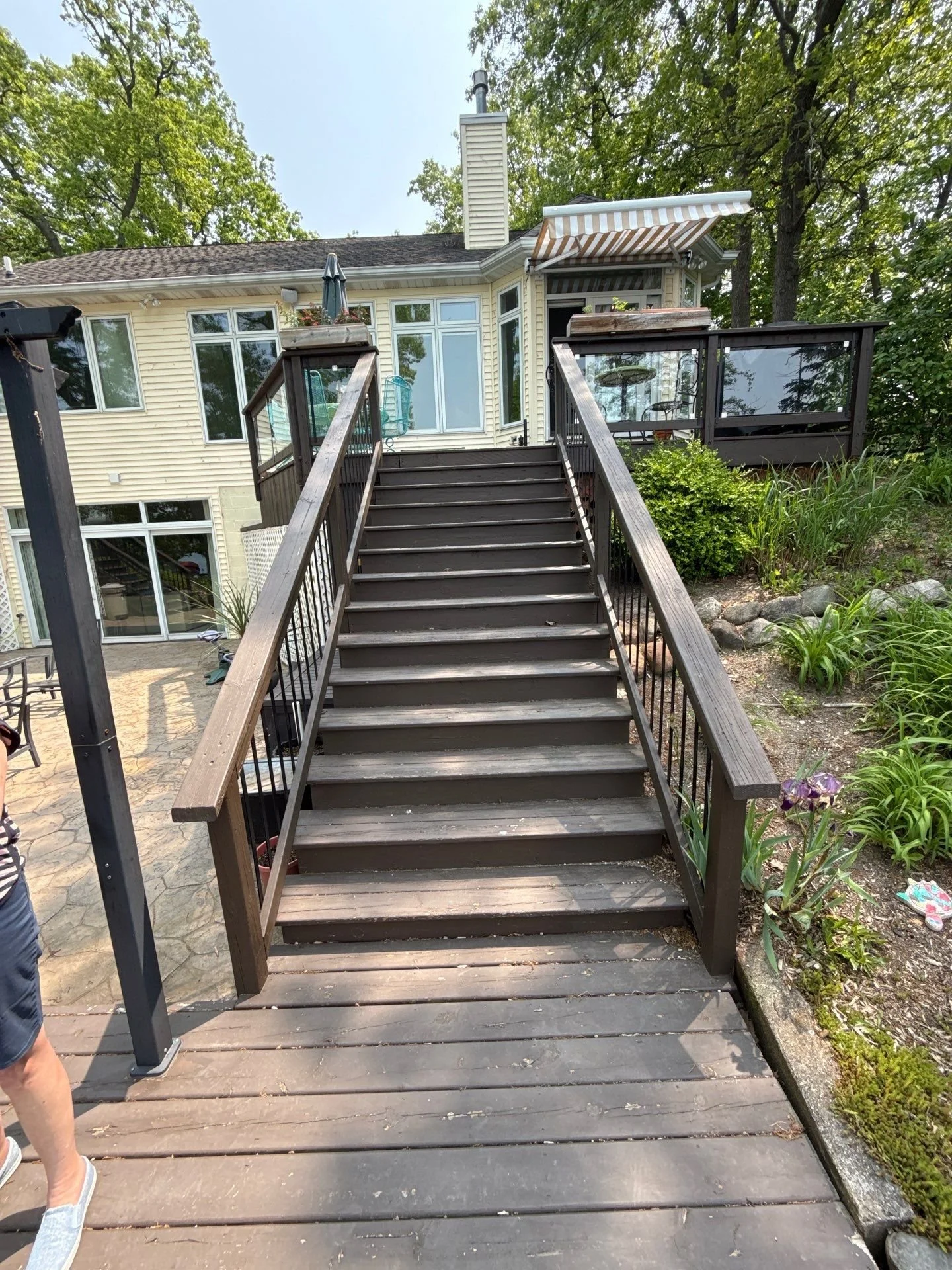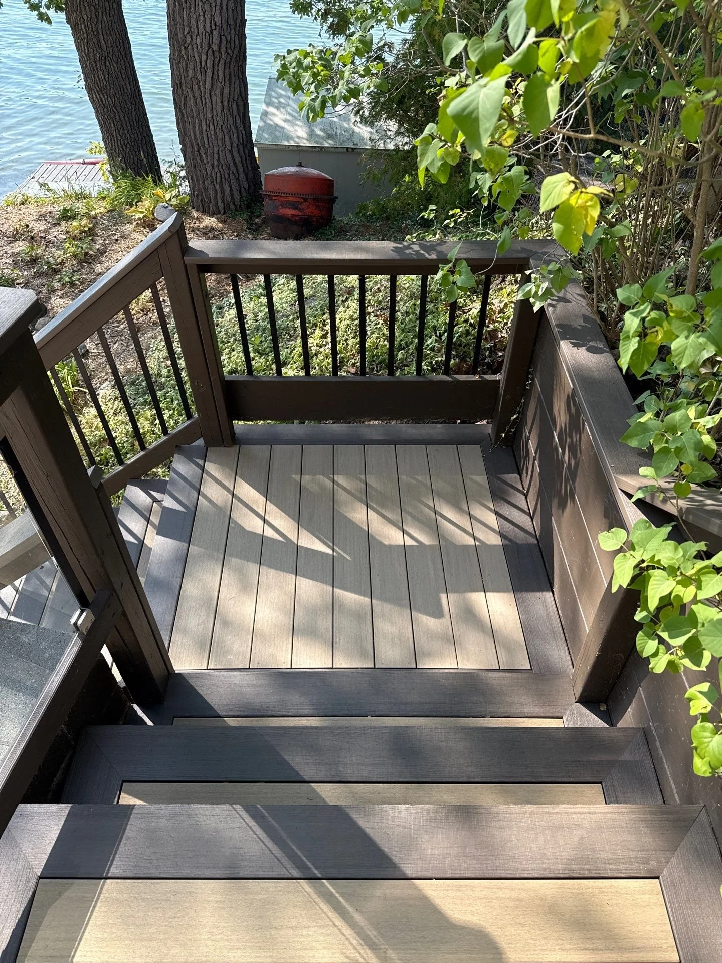 This three-story waterfront deck on Pleasant Lake received a complete facelift with brand-new composite decking and sleek modern railings throughout. The updated design brings new life to the home’s lakeside retreat, offering durability, low maintenance, and timeless style for years of outdoor enjoyment.
