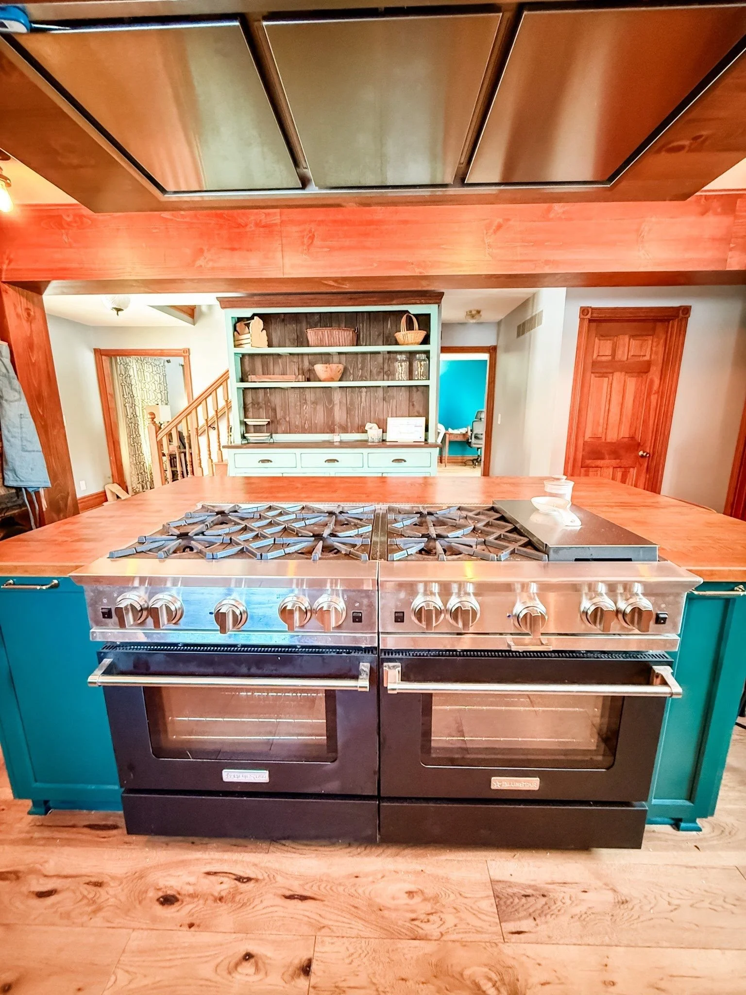 The space is centered around a large island that now serves as the focal point. It was built to support everyday meals and a family-run business, featuring two gas ranges, two sinks, a double 33-inch refrigerator, and two dishwashers.